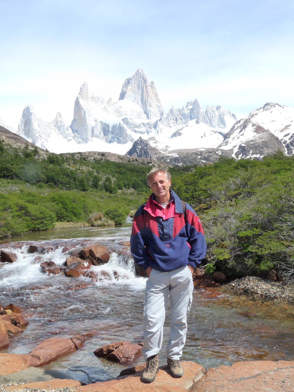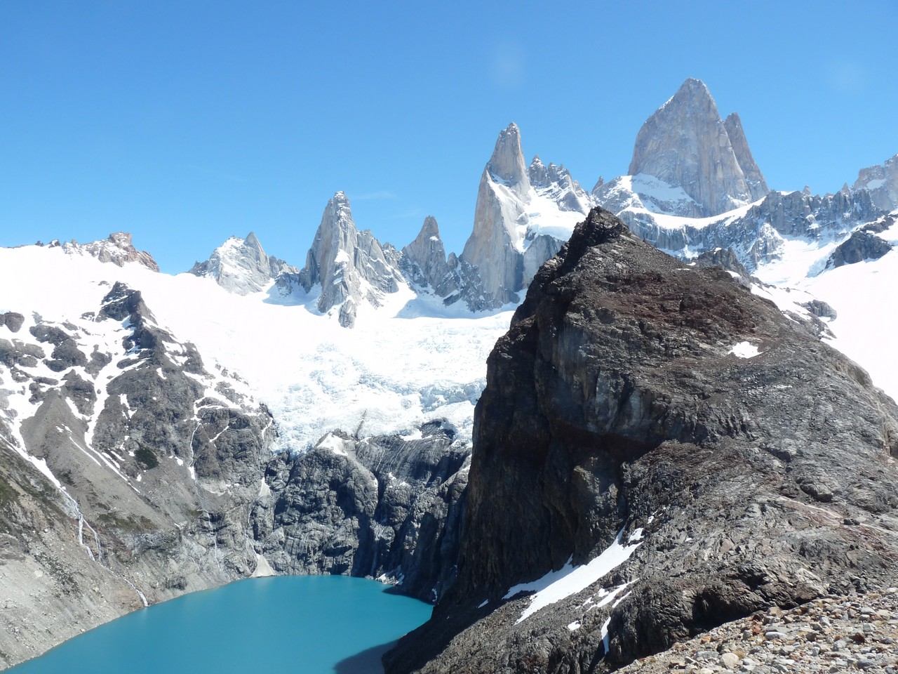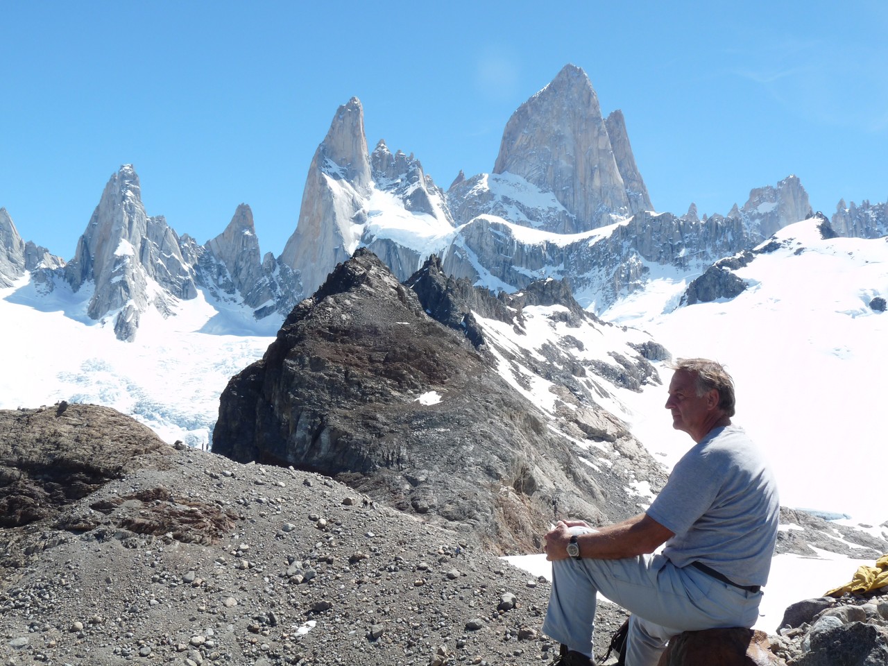Nous arrivons enfin à la laguna des «los tres» qui nous dévoile un panorama extraordinaire sur le Fitz Roy. Nous nous posons là un petit instant et pendant que j’admire le paysage, Yves passe sur un monticule de pierre qui donne un point de vue sur la laguna Sucia.