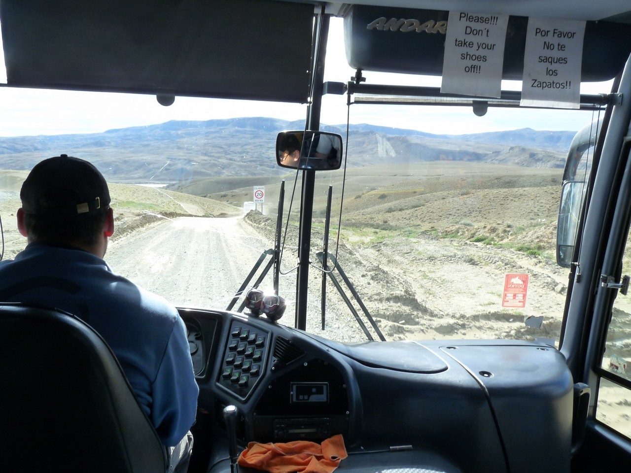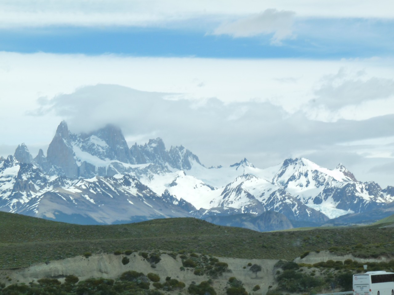 Chargés comme des mulets nous regagnons le terminal de bus situé à environ 500 m pour prendre le bus qui nous conduit par une piste, puis par une route asphaltée jusqu’à El Chalten : il tangue fortement (certes en France, il serait interdit de rouler).