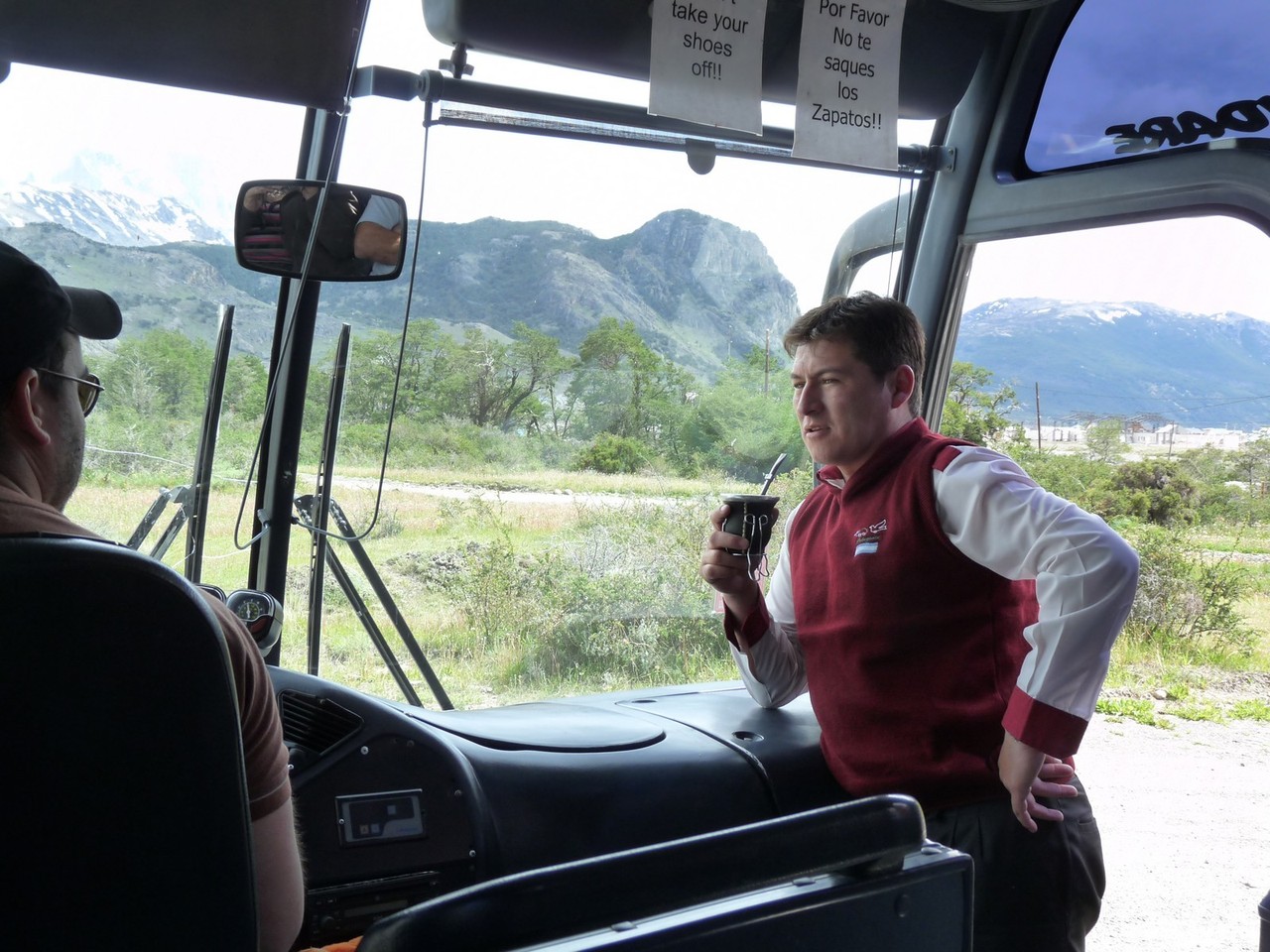 Le chauffeur du car en profite pour se détendre en buvant du mate avec un contrôleur du parc.
