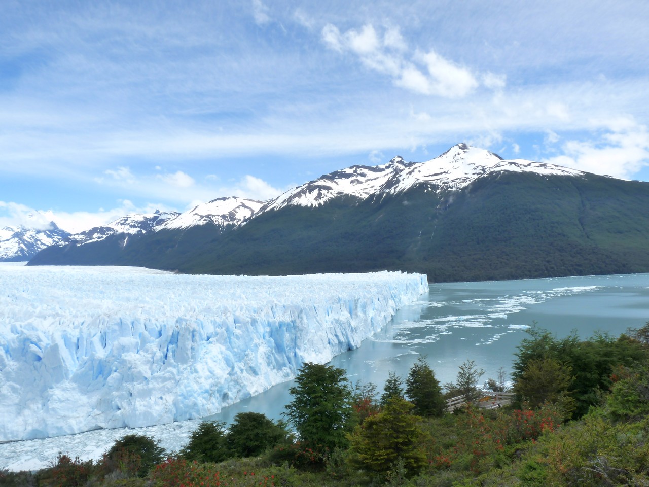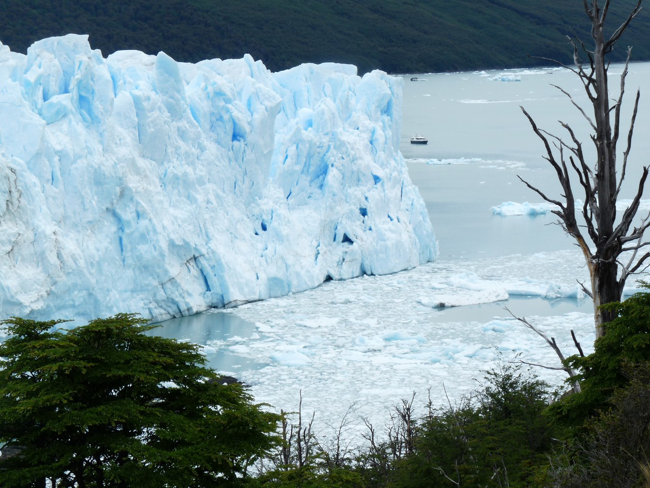 Nous avons passé une nuit moyenne avec le lit en cuvette et la chambre surchauffée (pourtant pas de chauffage). A 8h, nous partons  en direction de Périto Moreno, l’un des plus spectaculaire glacier andin de 15 kms x 5 kms situé dans le parc naturel «los Glaciares». Ce glacier est stable : il récupère par le haut ce qu’il pert par le bas c’est donc avec plaisir que l’on pourra attendre le détachement des séracs dans un bruit de tonnerre !