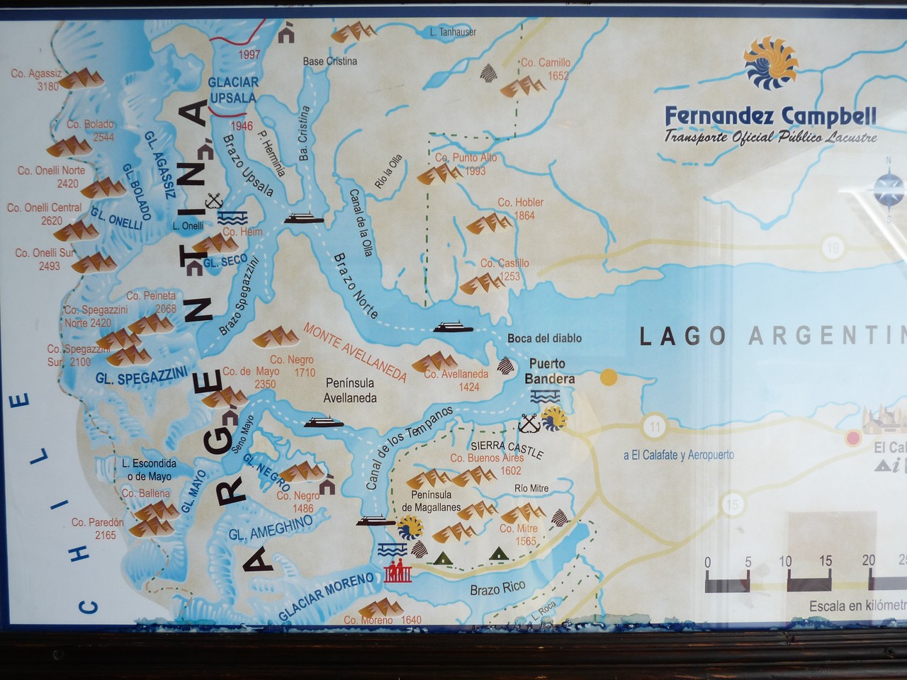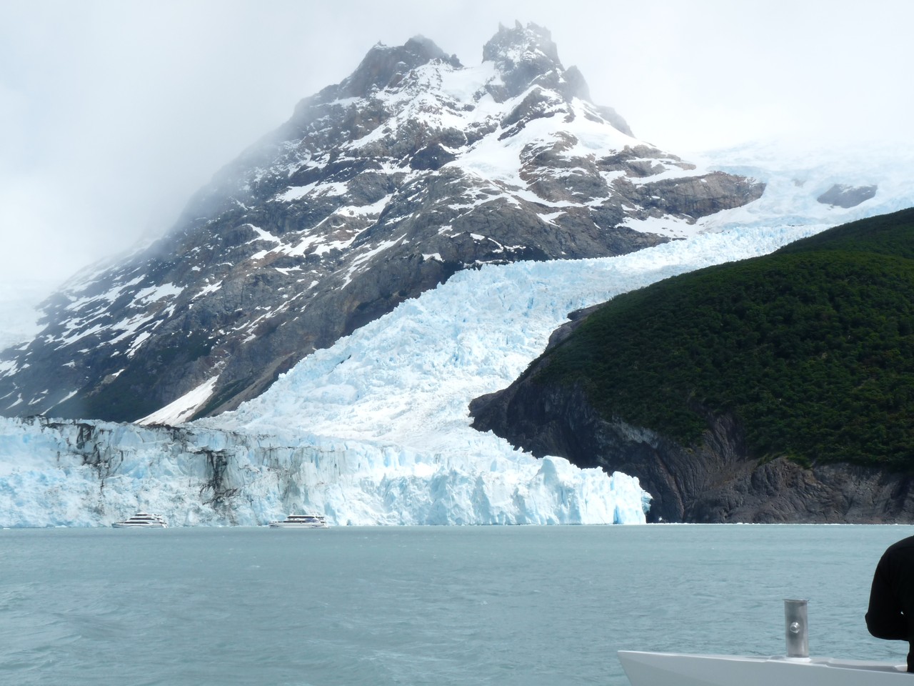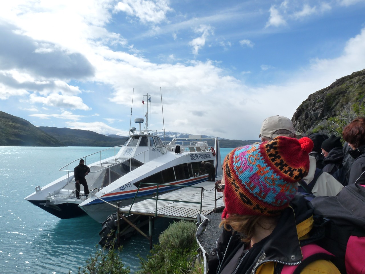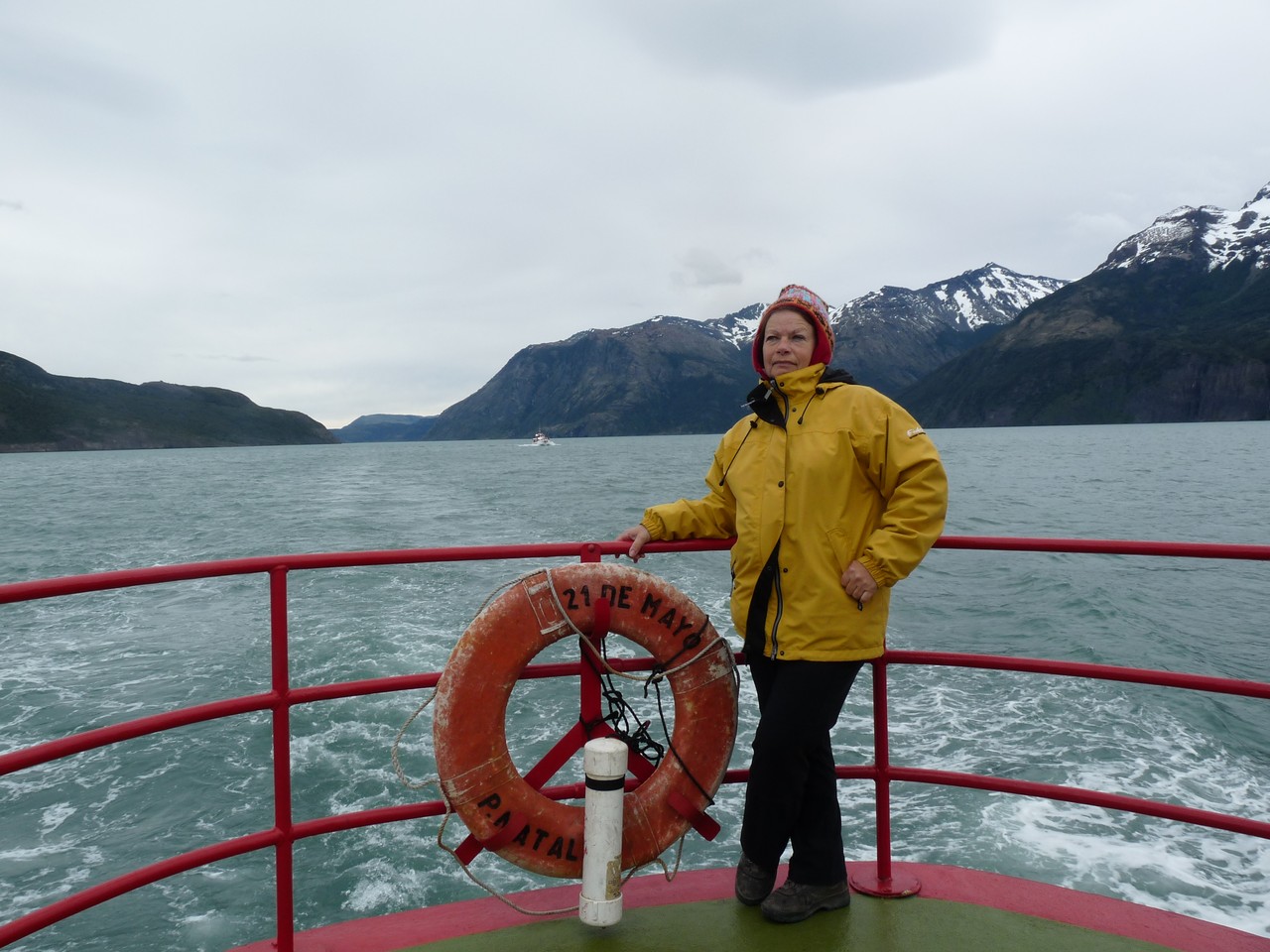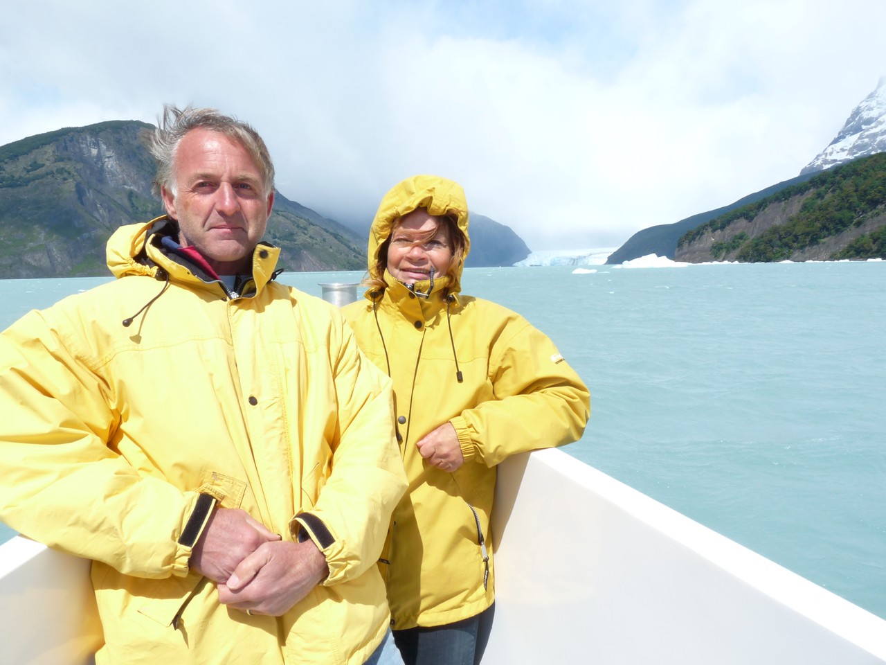 Le départ est fixé à 7h15 pour la découverte en catamaran du glacier Upsala d’une hauteur de 60 à 80 mètres et d’une superficie de 595 km2. Un bus vient nous chercher à notre logis : nous devons plaire à la guide qui nous embrasse comme si nous étions de vielles connaissances. Nous faisons la tournée des résidenciales pour prendre les personnes au passage puis nous changeons de bus pour en prendre un plus confortable et se rendre au parc national des glaciers  puis au bateau. Nous sentons là le tourisme de masse : il y a beaucoup de monde (comment sera doit-il être en été ?).
