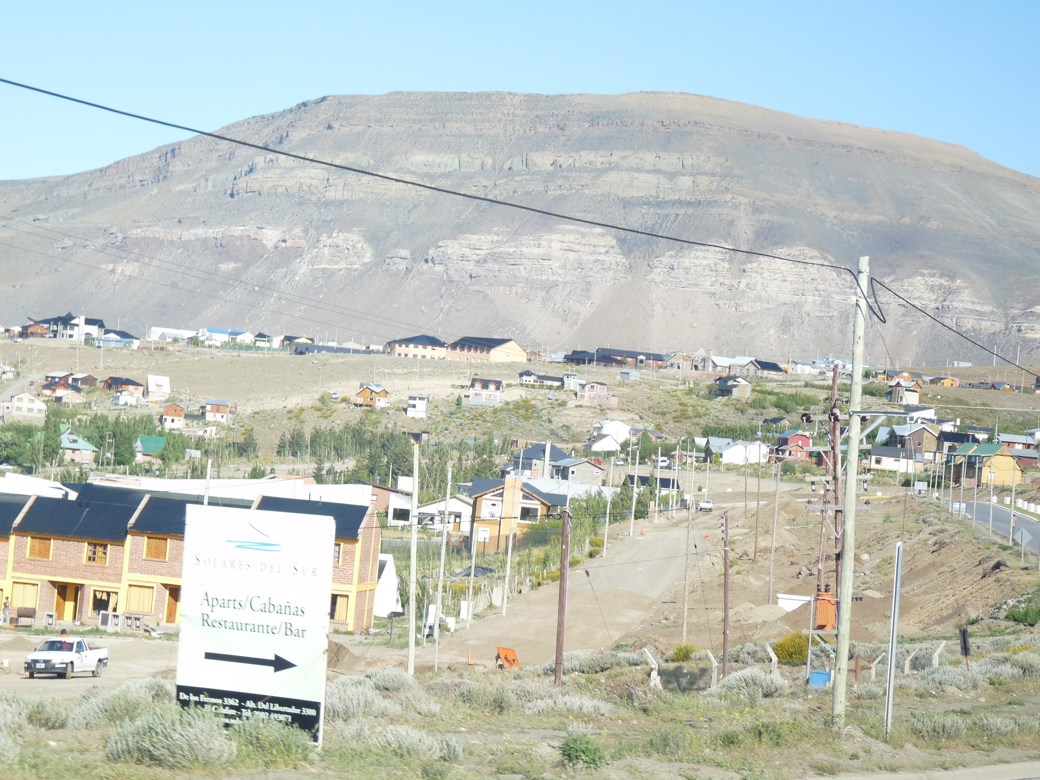 Après un bon petit déjeuner, nous faisons nos adieux à Maria et à sa fille. nous partons à 8 h chargés de tous nos bagages vers le bus qui nous amène en Argentine. Frontière passée sans problème, le chien n’a rien décelé d’anormal. Nous roulons à très petite allure sur la piste pour El Calafate : son nom lui vient d un arbuste à fleurs jaunes et baies noires (proche de la myrtille) très répandue dans la région et dont on fait d’excellentes confitures.