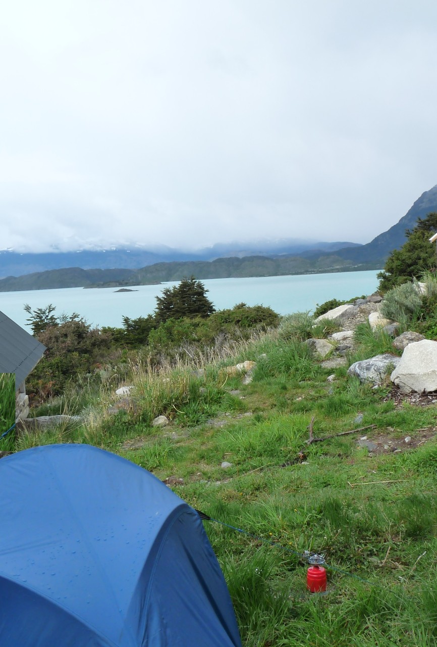 Il a plu une bonne partie de la nuit et le vent a soufflé par grandes bourrasques mais notre tente n’a pas failli ! Il a fallu attendre 8h1/2 pour que la pluie cesse, nous prenons notre petit-déjeuner sous la tente que nous plions ensuite toute mouillée. En raison de l’heure tardive et du temps nous ne pourrons continuer vers le lago Grey  (moi je l’aurais bien tenté car je pense que le temps va se lever (M).