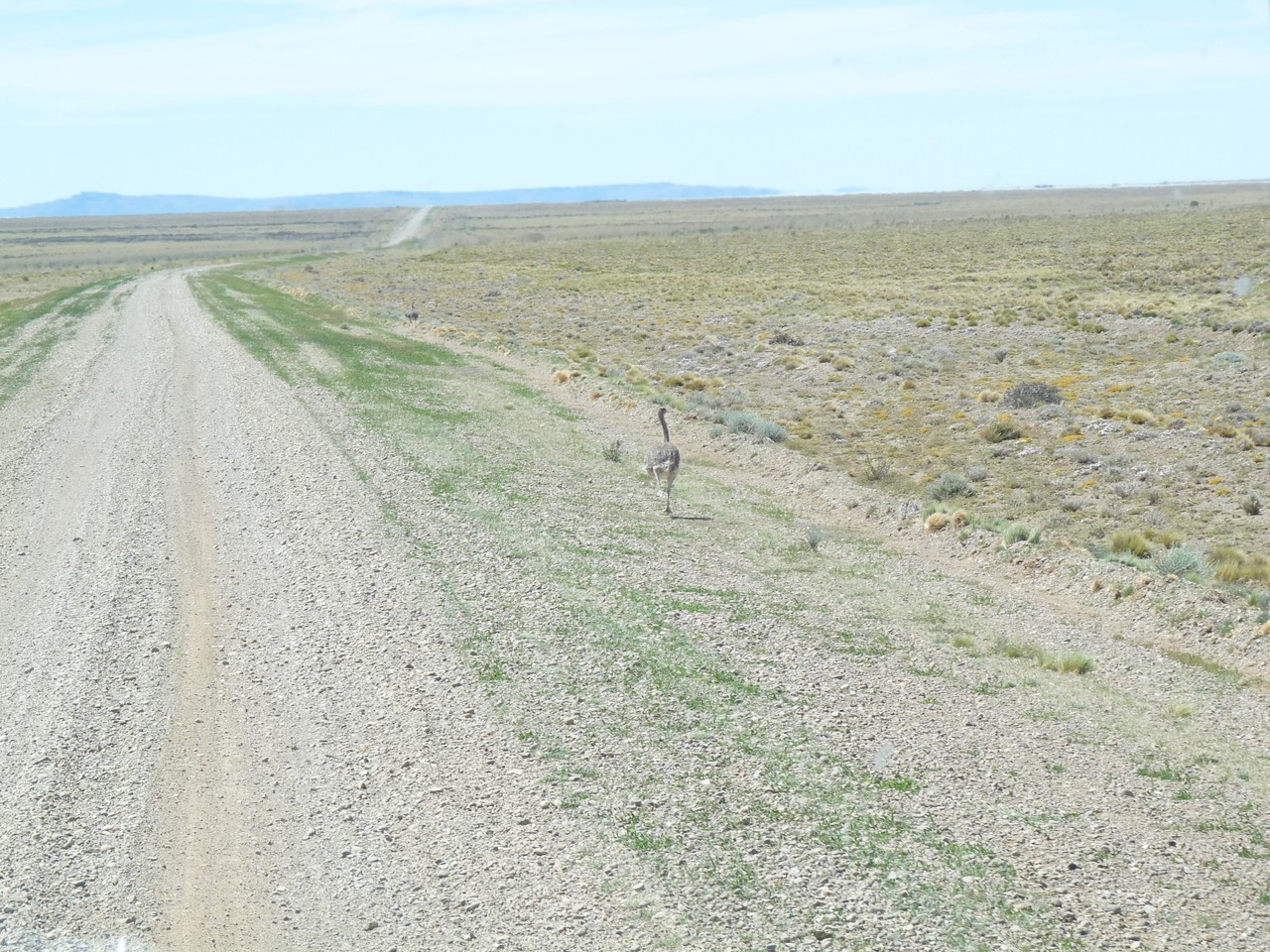 Nous voici dans le car en direction de la ville de Perito Moreno (destination stratégique pour éviter le retour à El Calafate, une route cimentée, une piste puis rapidement la mythique «ruta 40» qui n’a de route que le nom car il s’agit de terre et de cailloux. Nous apercevons des nandus, le chauffeur de car klaxonne pour chasser des guanacos au milieu de la route et sur le bord, d