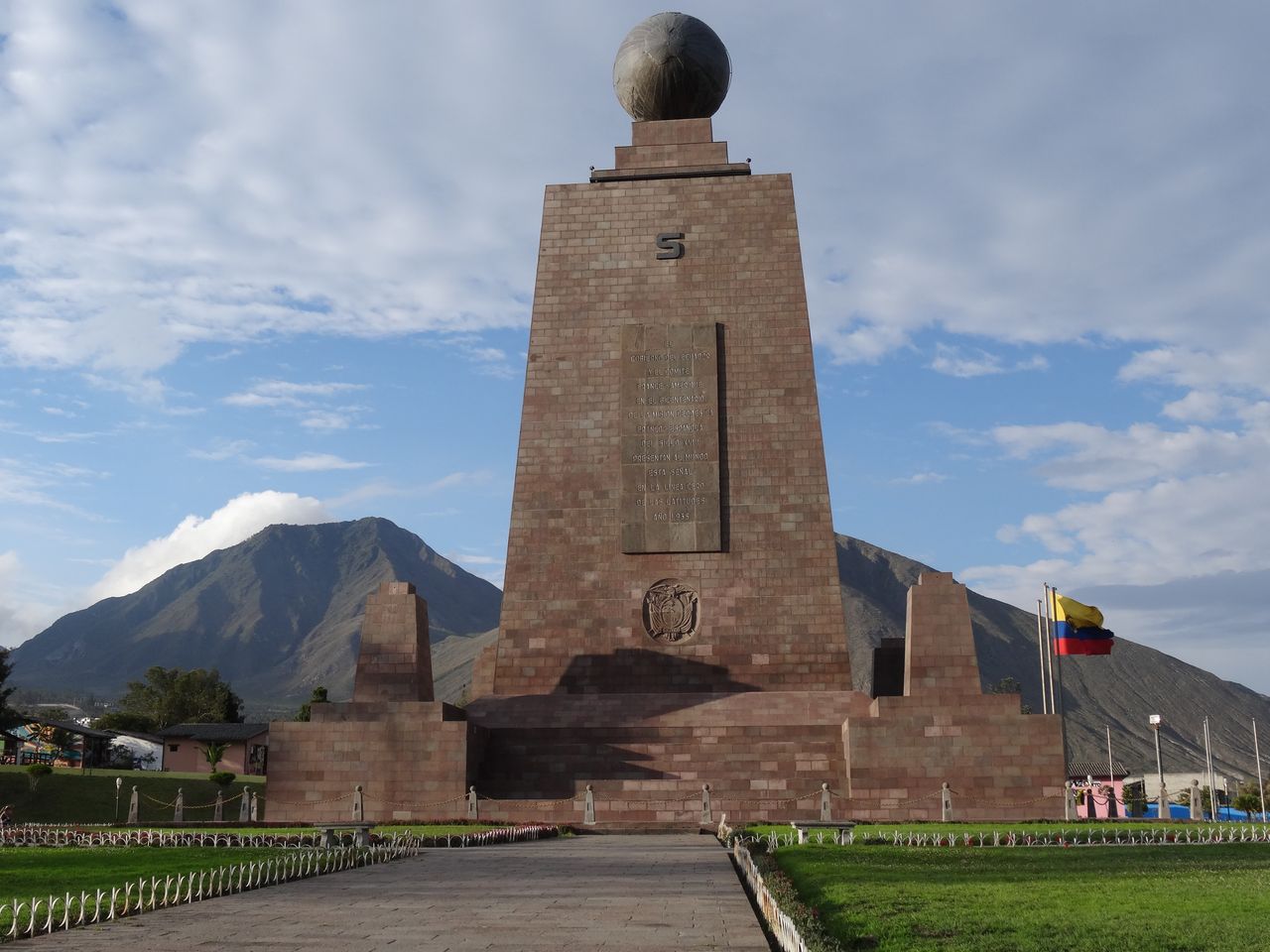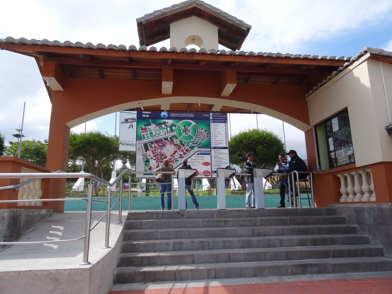 De retour à la Mitad del Mundo, longitude 78° 27’ 08’’ – latitude 0° 00’00’’ Nous entrons sur le site par une porte sans indication et partons prendre des photos de la ligne de la moitié du monde : un pied de chaque côté. Nous nous rendons compte que cette porte ouverte n’était pas l’entrée, nous nous y rendons donc  pour nous acquitter des  frais d’entrée. Les gardes ont bien rigolé de nous voir sortir pour  re-rentrer payer.