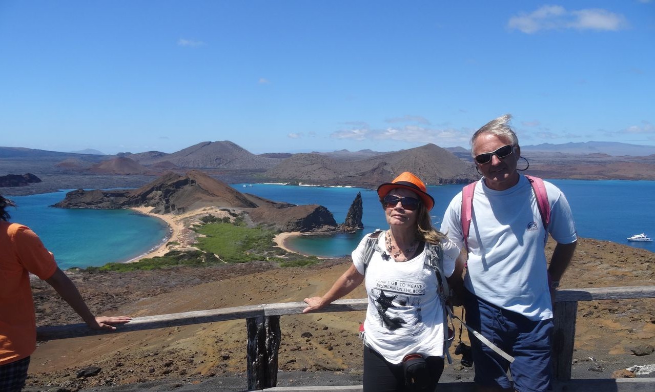 Ce matin debout à 5h. le bus doit venir nous prendre à l’hotel et c’est le guide qui vient nous chercher, le bus est dans une rue un peu plus loin. Nous traversons Santa Cruz jusqu’au départ du bac et rejoignons notre bateau en zodiac. Ahhh rien à voir avec hier, aujourd’hui nous sommes seize, le bateau est accueillant, nous y prenons notre petit déjeuner autour d’une table tout en nous dirigeant vers l’ile.