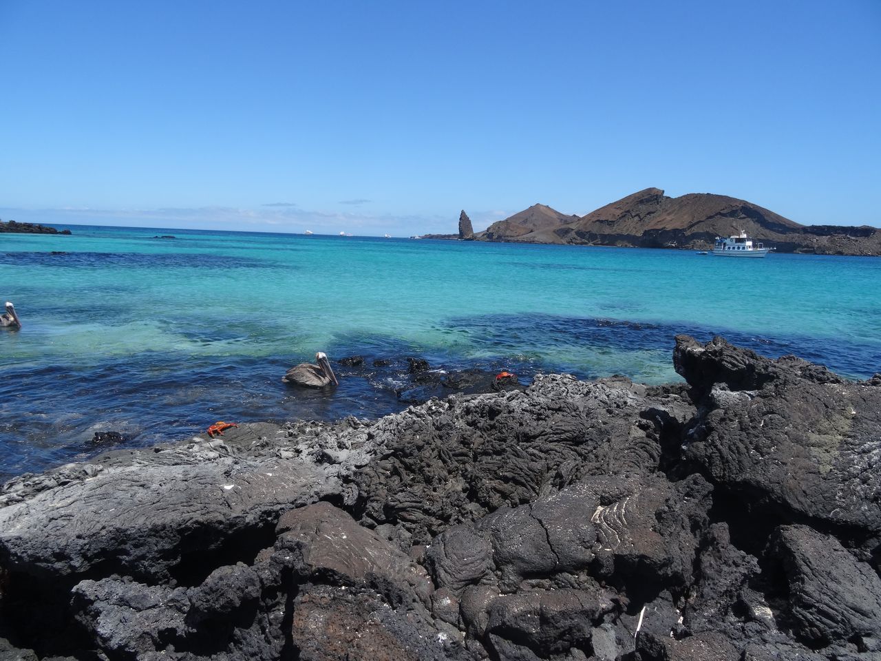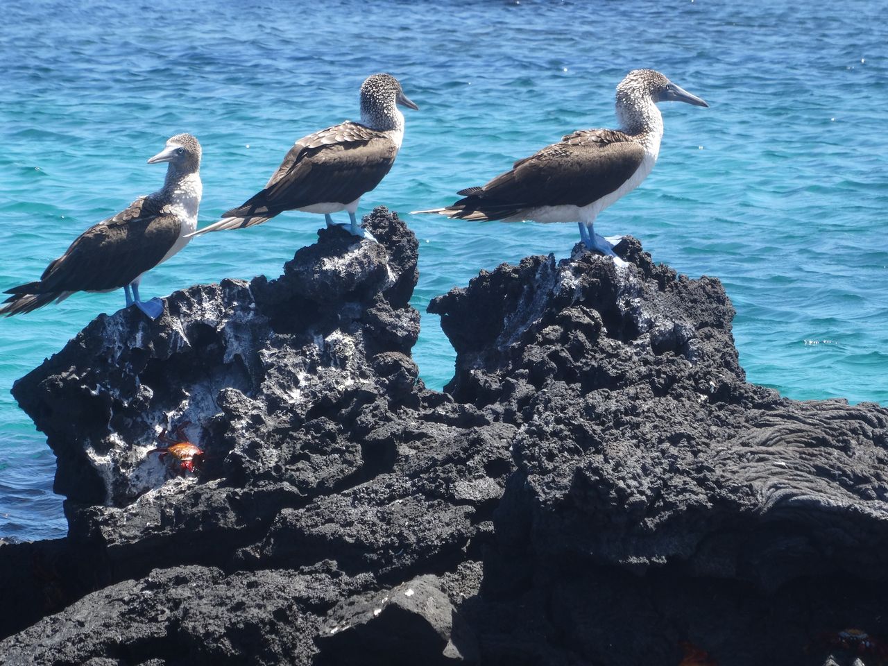 Nous rejoignons le bateau qui nous transporte à une plage en face de l’ile. Nous emportons avec nous masque et tuba, dommage il n’y a pas de palme. Nous nous baignons parmi les poissons multiples, de très beaux noirs avec une collerette jaune, tortues marines, otaries, pingoins, crabes tandis que les pequenos à pattes bleues plongent dans l’océan. Pas d’effort à faire l’eau nous maintient en surface et nous comtemplons ces spectacle. Quelle merveilleuse journée !