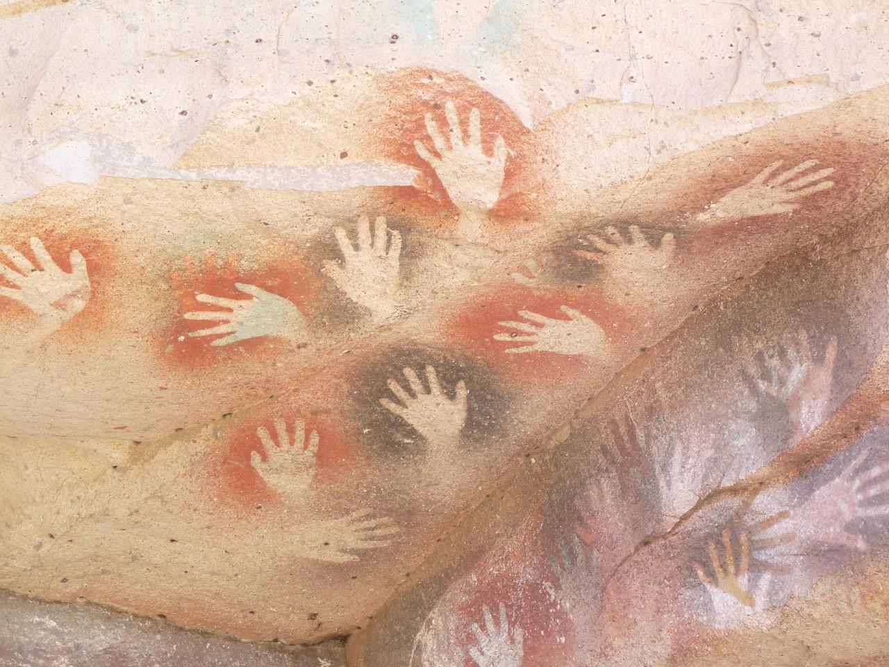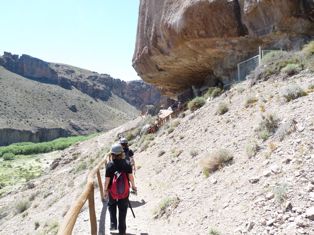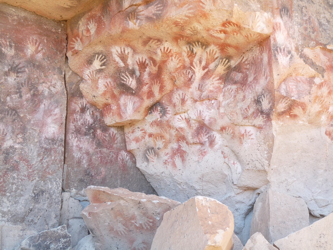 Nous arrivons sur notre lieu de visite à 11h 15, je demande au chauffeur s’il fait froid à l’intérieur de la grotte et lorsqu’il me répond «aussi chaud qu’ici» je n’ai pas compris de suite…en fait, dans le canyon très pittoresque du Rio Pinturas, les peintures préhistoriques qui représentent des mains et des animaux sont visibles sur les parois de la roche. Ce site est le plus important site rupestre de la Patagonie inscrit au patrimoine Culturel de l’humanité.