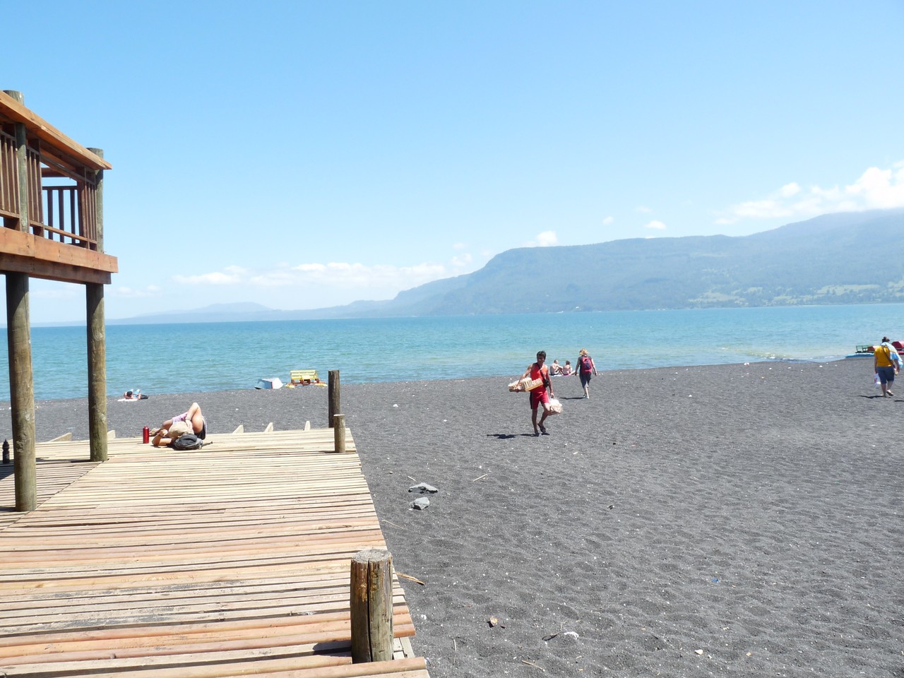 La ville est très agréable, nous sommes à deux pas du lac qui lui aussi, est superbe avec sa plage de sable noir, plusieurs personnes s’y baignent, il fait tellement chaud ! Et moi (m) j’ai envie d’y aller car l’eau est assez bonne. Le volcan a le tête un peu dans les nuages.