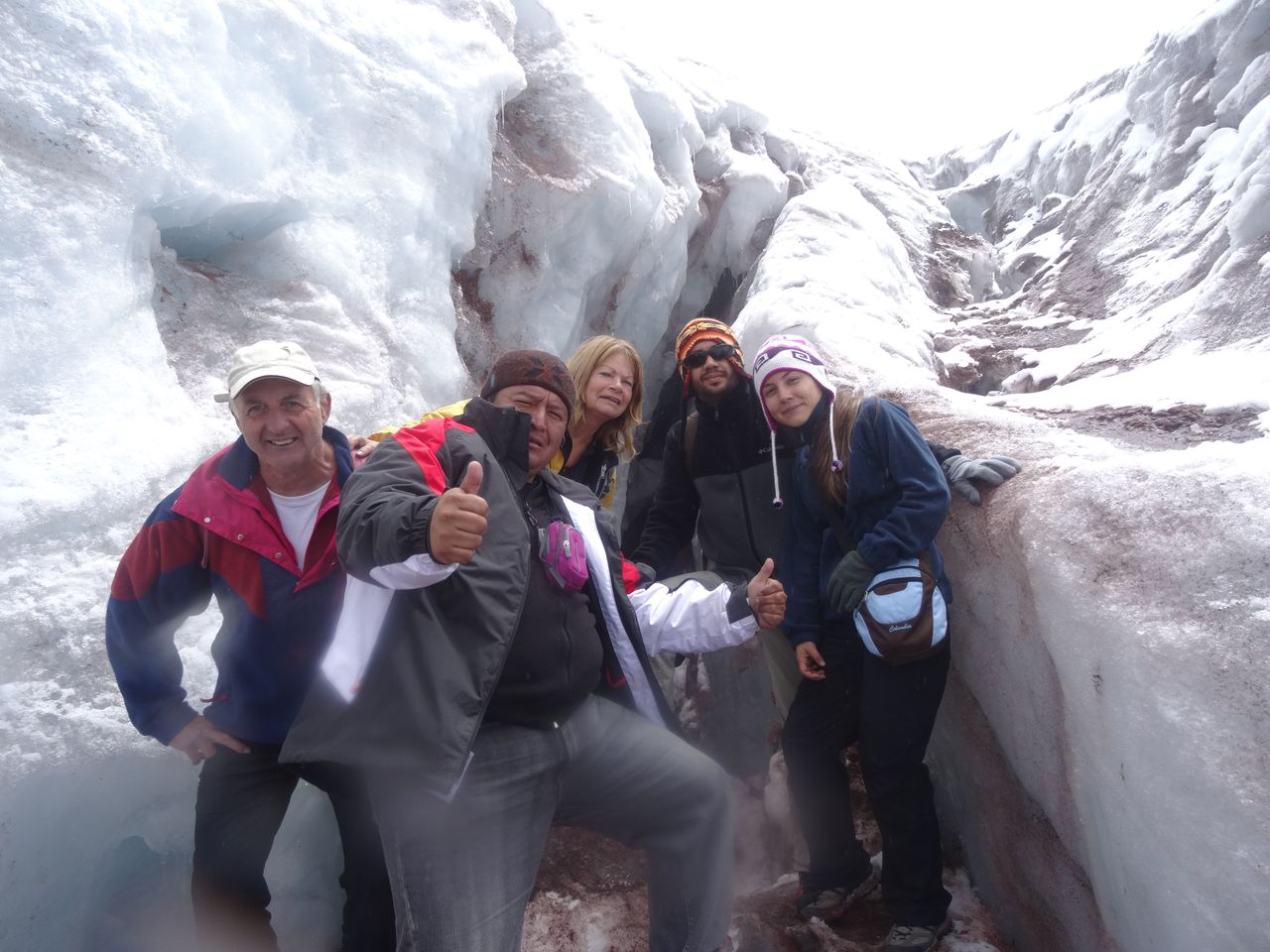 Nous faisons quelques arrêts pour photographier le volcan qui émerge des nuages et stationnons au parking situé à 4 600 m d’altitude. Sylvia la Colombienne qui nous accompagne fête ses 28 ans aujourd’hui, nous lui commandons donc une bouteille de champagne à sabler au glacier.